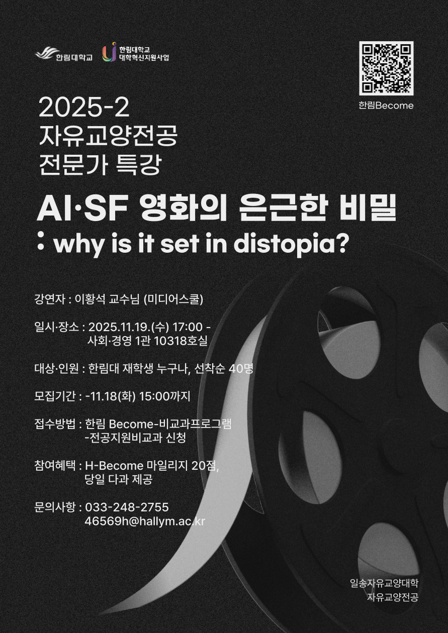 ■ 특강개요 : 미래 사회가 현실로 다가온 현재, 앞으로 인류가 직면할 문제를 함축적인 영화언어로 표현해 왔던 SF 장르의 배경이 왜 디스토피아로 설정되어 있는지 질문을 던지고, 그에 관한 철학적 사유를 이끌어 본다.